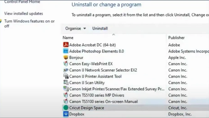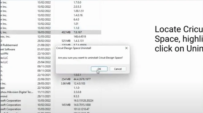Step 2: Locate and select the Cricut Design Space, then click “Uninstall” in the top bar.